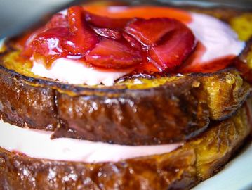 French toast served with your choice of warm strawberries blueberries & peaches or add all turn up