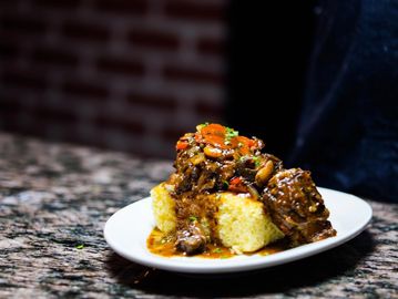 Southern fried chicken & waffles . Waffle topped with warm peaches & vanilla ice cream